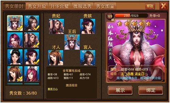 5、 秀女共有5个星级(品质),星级越高,秀女升级时提升的属性越高;